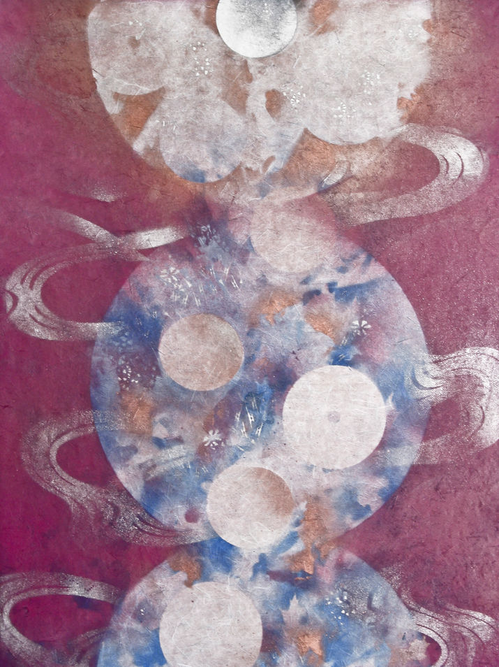 Years later, while living in Tokyo, I learned the Nihonga painting technique (pigment and glue on mulberry paper mounted on board). I created textured effects by using colored patterns of pochoir on top of the flat Nihonga layer. In effect, I started mixing western techniques with traditional eastern methods and in the process became aware of my own Japanese American cultural duality. This inner dynamic tension between Eastern and Western aesthetics continues, but I always strive for a sense of balance and harmony in my work.